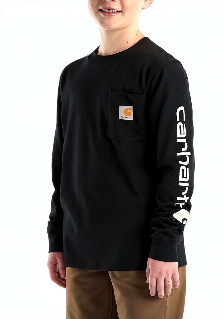 The Carhartt Boys’ Long-Sleeve Logo Sleeve Pocket T-Shirt is built for durability and comfort, featuring a rib-knit crew neck and long sleeves for a secure fit. It includes a left chest pocket with a sewn-on Carhartt label, adding both functionality and brand identity. Side-seam construction minimizes twisting during wear, while the tagless neck label ensures a smooth feel against the skin. Made from high-quality materials, this tee is designed to withstand active use while maintaining its shape and softness wash after wash.