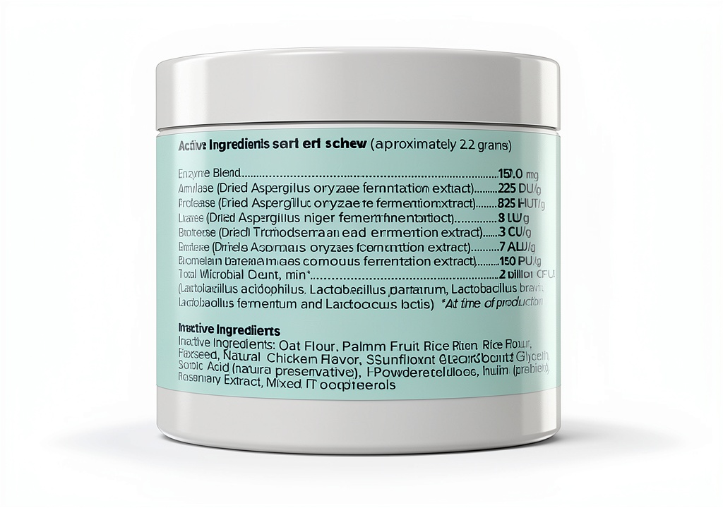 Great Pets Dog Probiotics Chews are specially formulated to support your dog’s digestive system with high fiber, probiotics, and digestive enzymes. These soft chews help alleviate issues like diarrhea, loose stools, constipation, gas, bloating, and bad odors, promoting firm and bulky stools for optimal gut health. Each package contains 120 chicken-flavored chews, made in the USA with no corn, soy, artificial flavors, or preservatives. Key ingredients include 2 billion CFU probiotics, inulin, omega fatty acids from flaxseed, and enzymes such as amylase, protease, lipase, cellulase, lactase, and bromelain. The product features powdered cellulose as a safe inactive ingredient to prevent sticking, ensuring freshness and ease of use.