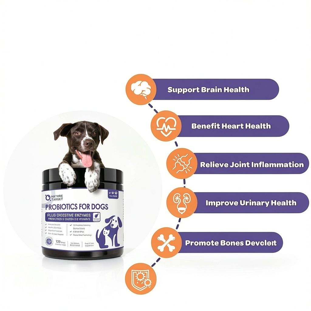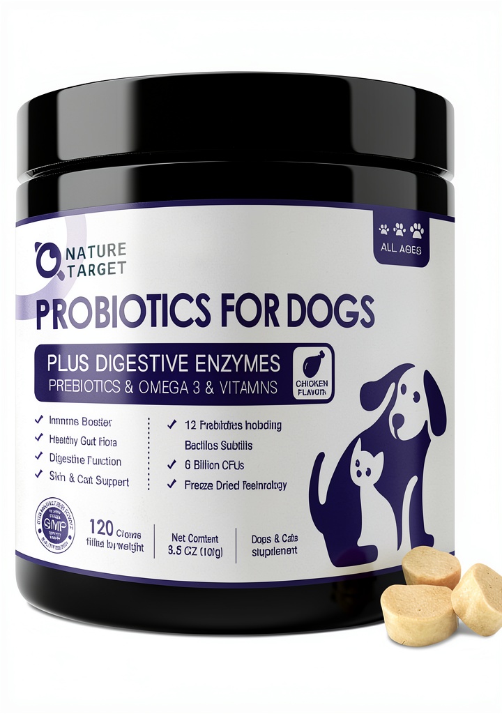 NATURE TARGET freeze-dried dog probiotics are formulated to support your pet’s digestive and overall health with 6 billion CFUs and 12 strains of beneficial flora. Using advanced freeze-dried technology, these chews maximize probiotic activity and stability, ensuring effectiveness once consumed. Key ingredients include high-quality fish oil rich in Omega-3 fatty acids for skin and coat health, along with zinc and antioxidants. The product is all-natural, based on real chicken, and free from artificial additives, making it safe and appealing for dogs. Specifications include package dimensions of 9.29 x 3.86 x 3.82 inches, a weight of 3.5 ounces, model number T06-GYSJKL-120, and an ASIN of B09ZQM7HQN, first available on April 26, 2022.