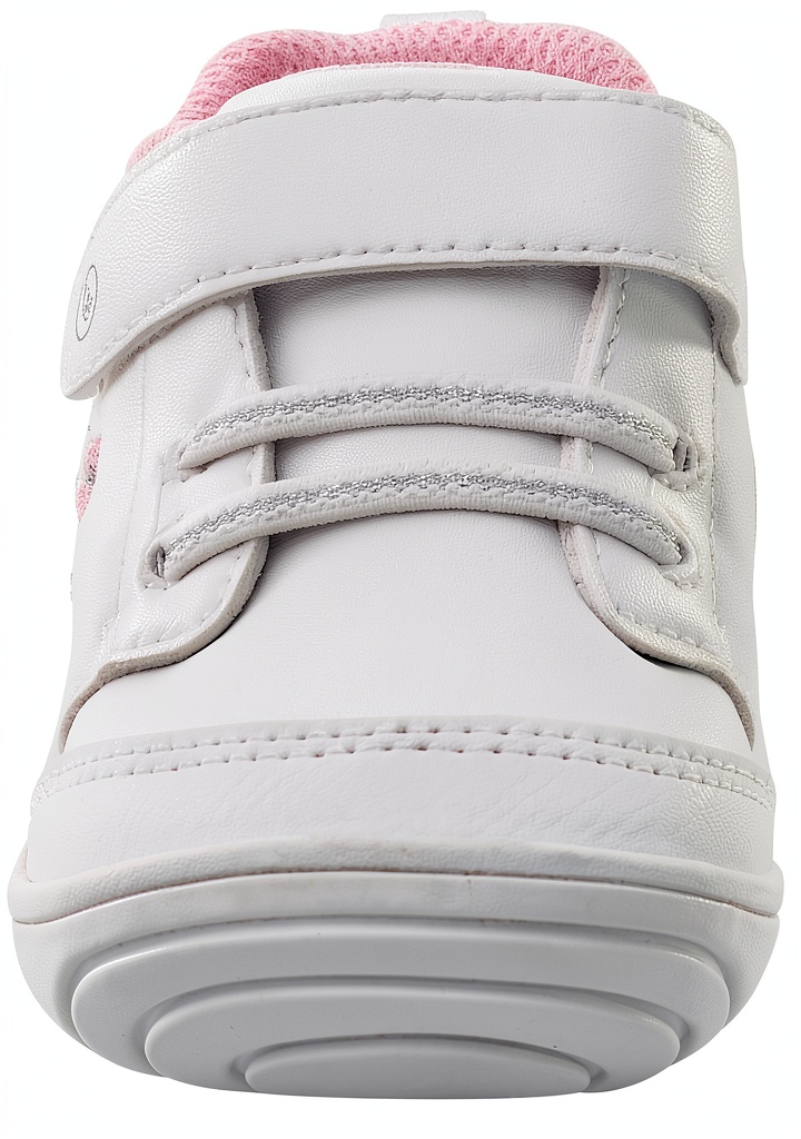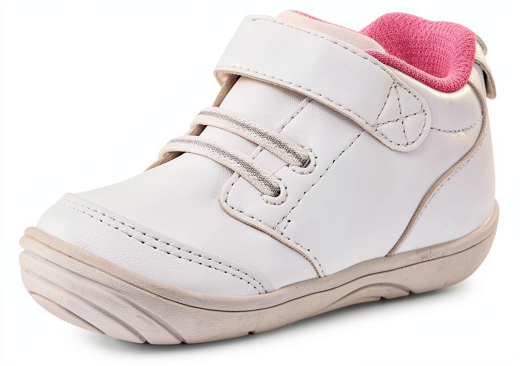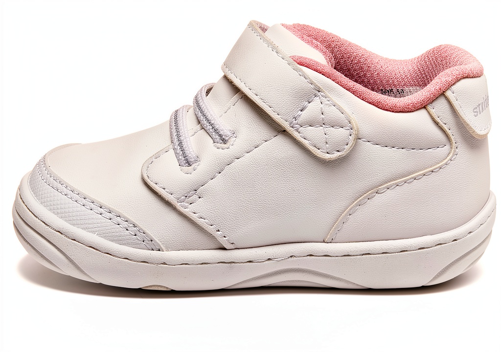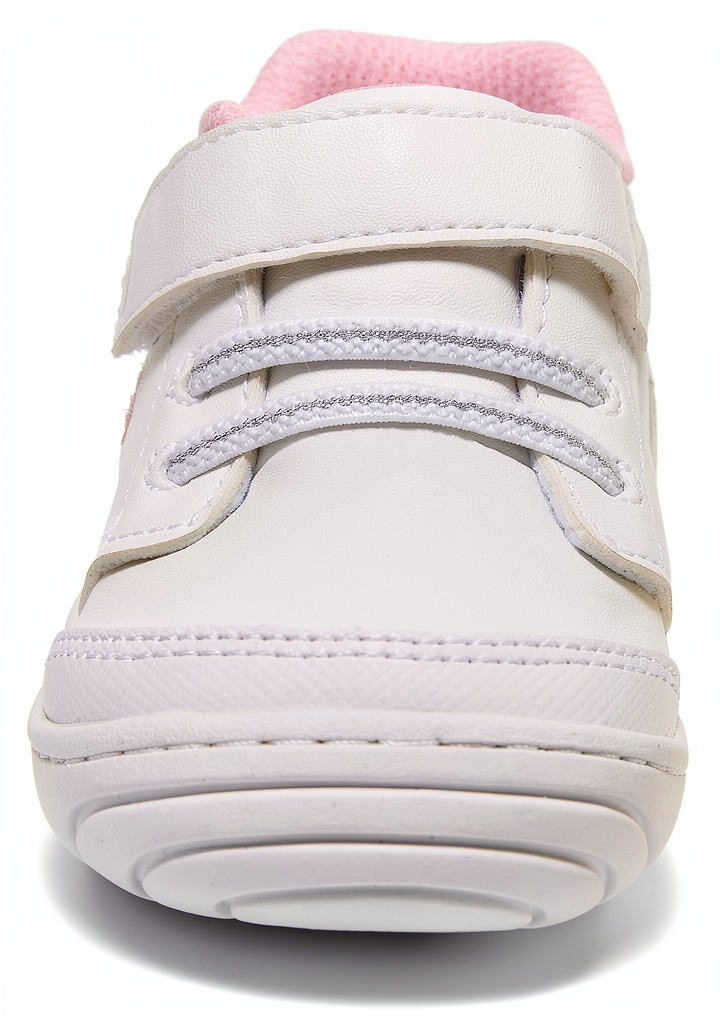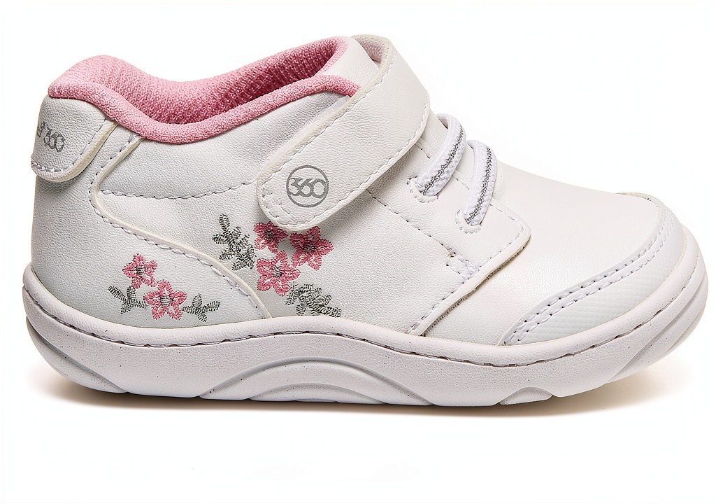Stride Rite 360 kids sneakers are designed for independent walkers, featuring flexible rounded soles and a dual-fit system with removable sock insoles. These durable shoes include memory foam footbeds for enhanced comfort and faux elastic laces for a sporty look. Available in white and pink colors across infant and toddler sizes, they are machine washable and easy to clean with mild detergent. The manufacturer, Stride Rite 360, ensures quality with a warranty available through customer service.