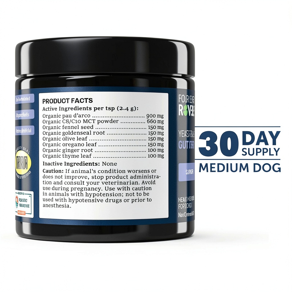Yeast Guard by Four Leaf Rover is a veterinarian-formulated supplement crafted to address yeast issues in dogs through a natural, gentle approach. Made with handcrafted organic herbs, this product supports detoxification from yeast without harsh chemicals, focusing on areas like ears, paws, and skin. Key specifications include model number 628504393178, first available in March 2022, and a ranking among top dog probiotic supplements. It provides comprehensive care to keep pets comfortable and healthy, backed by a satisfaction guarantee for peace of mind.
